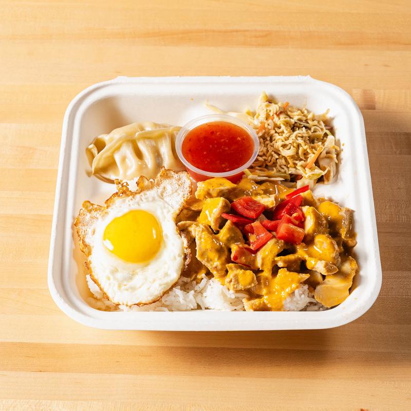 Chicken thigh, white rice, fried egg, 2 chicken dumplings, and Asian cabbage salad | Replace with Chicken Breast $1