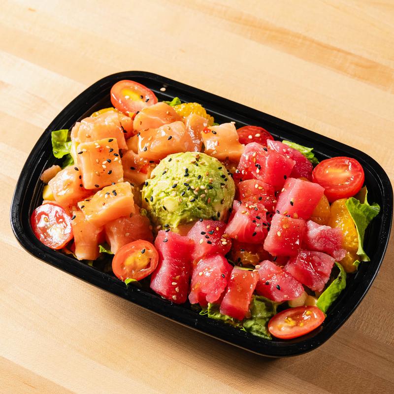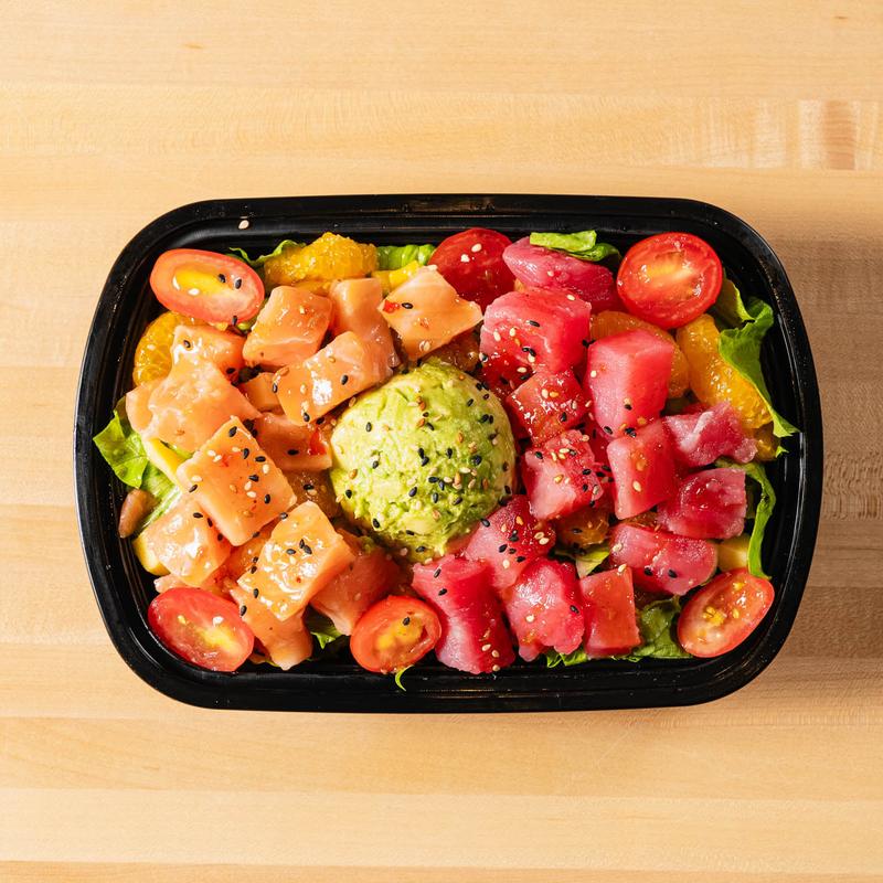 Choice of tuna, salmon, or both | Leaf lettuce, grape tomatoes, edamame, mango, mandarin oranges & avocado | Small $12.95, Reg $16.95