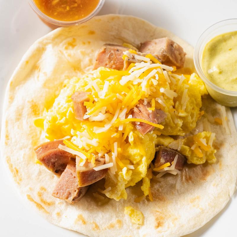 Sliced chicken apple breakfast sausage, fluffy eggs, topped with shredded cheddar jack cheese & served in a warm flour tortilla. Regular $3.25 | Dozen $37.95 • Choice of mild salsa or creamy jalapeno salsa | Gluten Free if substituted with corn tortillas.