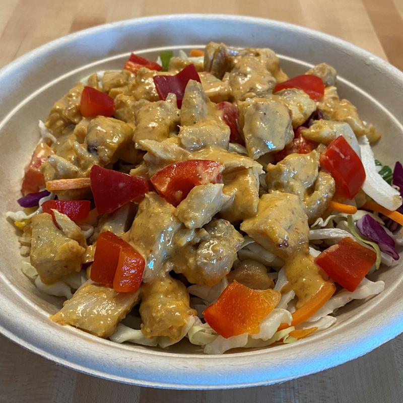Chopped green leaf lettuce with a blend of green cabbage, carrots, red cabbage, and green onions served with chicken thigh and crunchy ramen topping | Replace with Chicken Breast $1