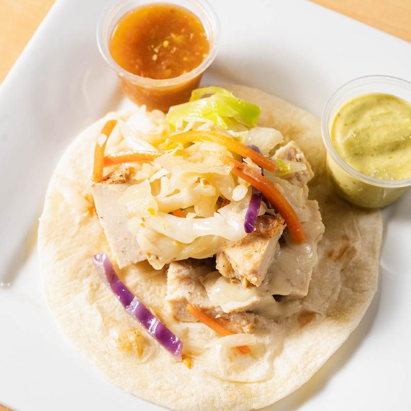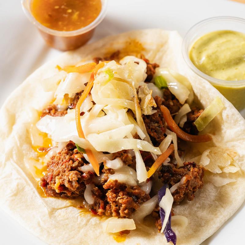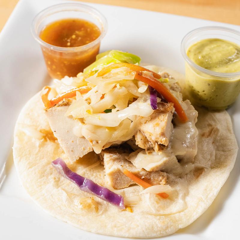 Seasoned soy protein with cabbage mix and cheese served on a flour tortilla. Your choice of mild salsa or creamy jalapeno salsa.
