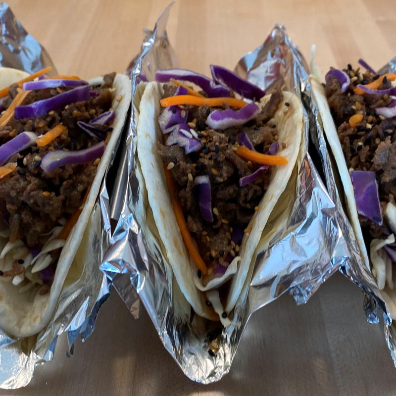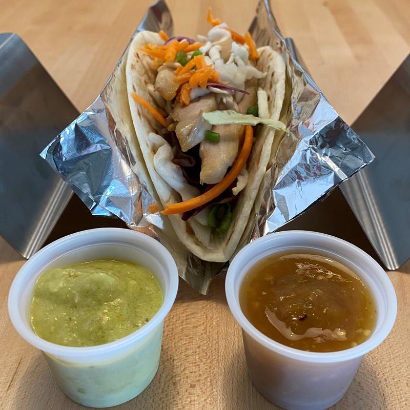 Chicken thigh, Asian cabbage salad blend served in a warm tortilla with choice of sauce | Individual $2.95, Dozen $34.95