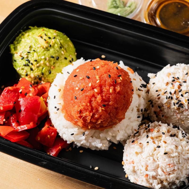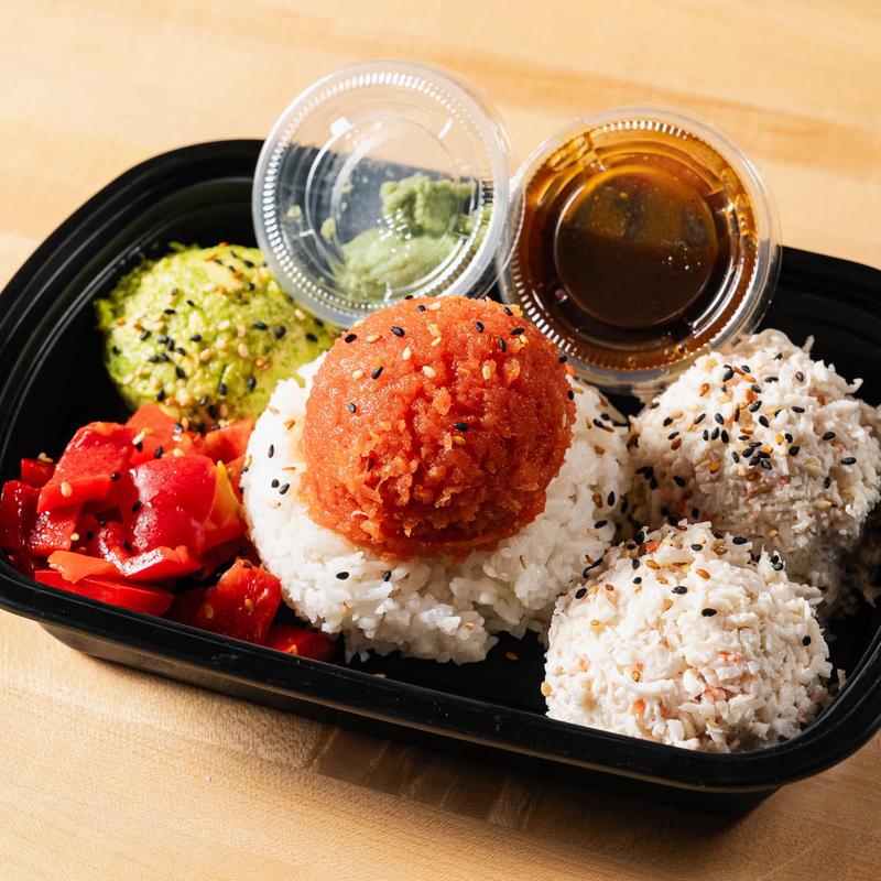 Spicy sashimi tuna, wasabi-crab salad, red bell pepper, and avocado | Small $10.95, Reg $14.95