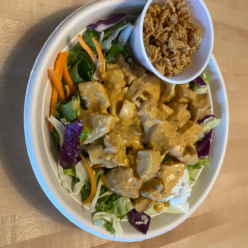 chopped green leaf lettuce with a blend of green cabbage | carrots | red cabbage | green onions served with chicken and crunchy ramen topping with your choce of dressing
