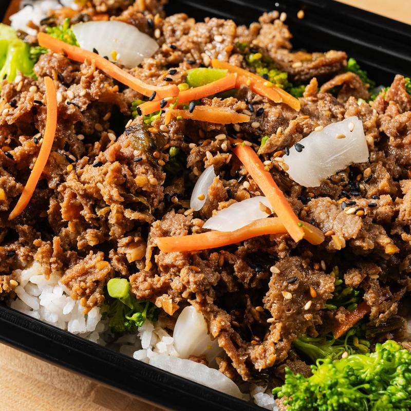 Small $10.95 | Reg $14.95 • Korean bulgogi prepped | marinated thinly sliced beef |steamed veggies
