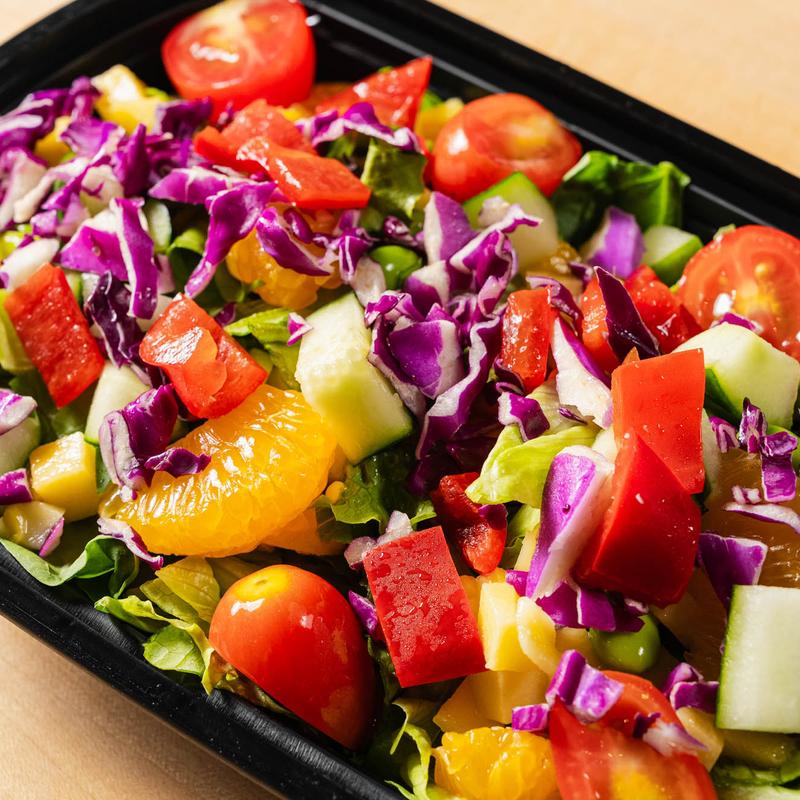 Small $ 9.95 | Reg $13.45 | fresh mix of spinach, edamame, cucumber, red cabbage, steamed vegetables, red peppers, tomato, mango, & mandarin oranges